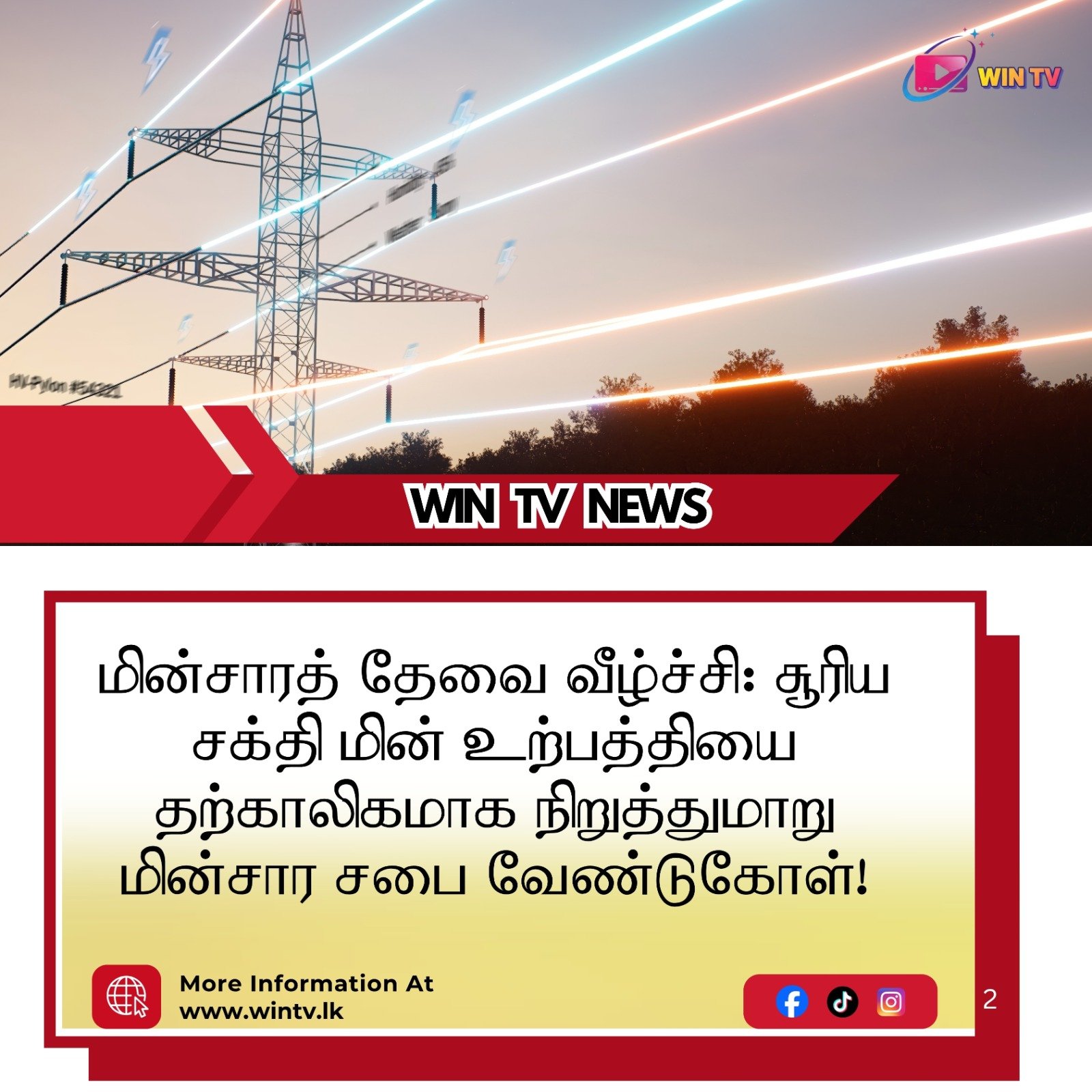 சித்திரை புத்தாண்டு தினமான இன்று (14.04.2026), நாட்டில் மின்சாரத்திற்கான தேவை வழக்கத்தை விட மிகக் குறைவாகக் காணப்படுவதால், தேசிய மின் கட்டமைப்பின் ஸ்திரத்தன்மையைப் பேணும் பொருட்டு சூரிய சக்தி மின் உற்பத்தி உரிமையாளர்களுக்கு விசேட அறிவித்தல் ஒன்று விடுக்கப்பட்டுள்ளது.தமது வீடுகள் அல்லது வர்த்தக நிலையங்களில் கூரை மேல் சூரிய சக்தி மின் உற்பத்தி கட்டமைப்புகளை கொண்டிருப்பவர்கள், இன்று பிற்பகல் 3:00 மணி வரை தமது இன்வெர்ட்டர்களை சுயமாக அணைத்து வைக்குமாறு கேட்டுக்கொள்ளப்பட்டுள்ளனர்.புத்தாண்டு பண்டிகையை முன்னிட்டு தொழிற்சாலைகள் மற்றும் வர்த்தக நிலையங்கள் மூடப்பட்டிருப்பதால், தேசிய அளவில் மின்சாரப் பயன்பாடு கணிசமாகக் குறைந்துள்ளது.மின்சாரத் தேவை குறைவாக இருக்கும் வேளையில், சூரிய சக்தி மூலம் அதிகளவு மின்சாரம் உற்பத்தி செய்யப்பட்டு மின் கட்டமைப்பிற்குள் அனுப்பப்பட்டால், அது மின்சார விநியோகத்தில் தொழில்நுட்பக் கோளாறுகளை ஏற்படுத்தக்கூடும்.பண்டிகைக் காலத்தில் நாடு முழுவதும் மின்சார விநியோகத்தைப் பாதுகாப்பாகவும், தொடர்ச்சியாகவும் பேணுவதற்காகவே இந்த தற்காலிக நடவடிக்கை எடுக்கப்பட்டுள்ளது.EDL (Private) Limited மற்றும் NSO (Private) Limited ஆகிய நிறுவனங்களின் சார்பில் விடுக்கப்பட்டுள்ள இந்த வேண்டுகோளுக்கு ஒத்துழைப்பு வழங்குவதன் மூலம், பண்டிகைக் காலத்தில் மின்சாரத் தடைகள் ஏற்படுவதைத் தவிர்க்க முடியும் என தேசிய மின் கட்டமைப்புச் செயல்பாட்டுக் கட்டுப்பாட்டு மையம் தெரிவித்துள்ளது.